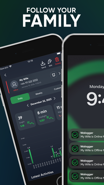 WaLogger⁺ adalah aplikasi yang dirancang untuk memantau aktivitas online keluarga dengan mudah. Aplikasi ini memungkinkan pengguna untuk mendapatkan akses real-time terhadap statistik online yang mendetail, sehingga dapat mengawasi kapan anggota keluarga aktif di internet dan berapa lama mereka menggunakannya. Fitur utama dari WaLogger⁺ termasuk laporan statistik harian, mingguan, dan bulanan, serta kemampuan untuk menerima notifikasi instan saat anggota keluarga online atau offline.